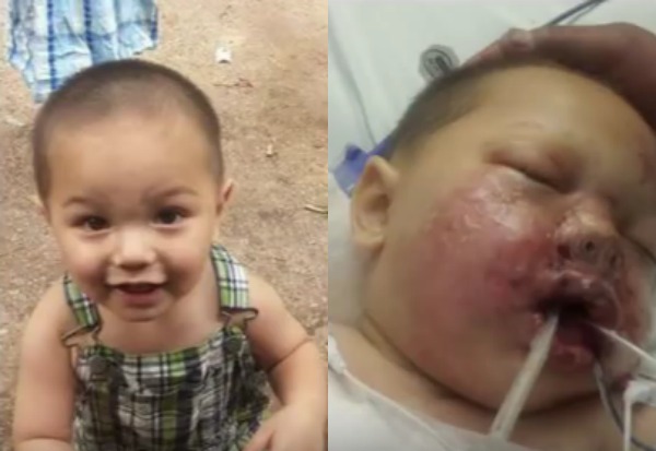 Despite that, the mother was told by officers her son only suffered a lost tooth, but later, a social worker informed her that her son was being treated for burns. The baby was in critical condition with burns on his face and chest.