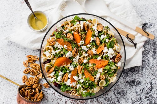 Mediterranean Pecan Pasta Salad Serves 10 Prep time: 15 mins Cook Time: 12 mins 1/4 cup salt 12 ounces pasta 4 cups radicchio, sliced 1 cup halved marinated olives 1/2 cup marinated artichoke, bite-size pieces 1/3 cup chopped sun-dried tomatoes 1 cup pecan pieces 3/4 cup chopped parsley or mint 6 ounces feta cheese 1 orange, sliced 2 cups chopped spinach Lemon vinaigrette and fresh cracked pepper (optional) 1. Bring a pot of water to a boil with 1/4 cup of salt. When water is boiling, add in pasta, and cook about 10 minutes. When pasta is cooked, set aside. 2. In a large, clear bowl, layer half the radicchio, and half of the olives, artichoke, and tomato on top. Next, add half the pasta, 1/2 cup of pecans, half of the parsley, 3 ounces of feta, and the orange slices. 3. Add the spinach, then repeat layering with the radicchio, olives, artichoke, tomato, pasta, pecans, parsley, feta, and orange. 4. If using dressing, add after layering is complete. 5. Add fresh pepper and refrigerate before serving.