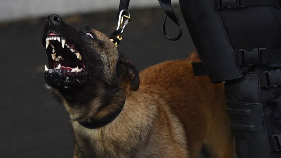 The officer in control of the dog’s leash then gets the animal up, the man attempts to stand but stumbles, causing the dog to lunge at him again, this time biting one of his legs. The biting continues for another 30 seconds.