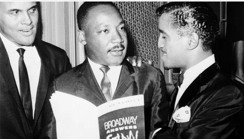 Here, King is pictured with Belafonte and singer-comedian extraordinaire Sammy Davis, Jr. in 1965 at a benefit show in NYC called Broadway Answers Selma.