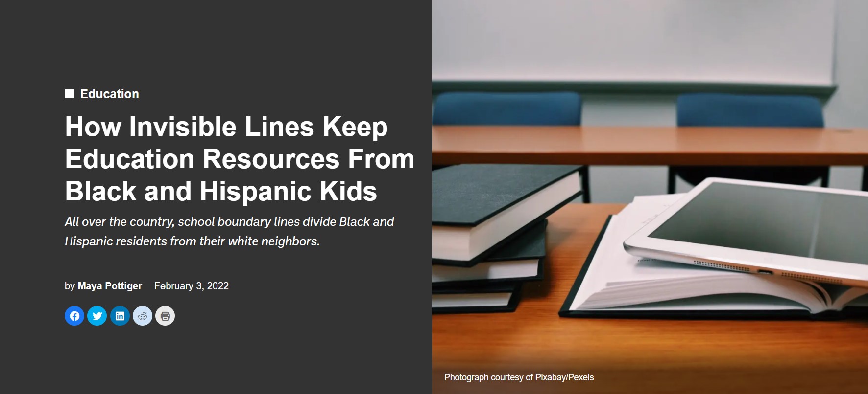 The Urban Institute’s Dividing Lines report features an interactive map to show where school boundaries are drawn and exactly how schools remain segregated. Seemingly arbitrary imaginary lines group Black and Hispanic students together, keeping white students on the other side.