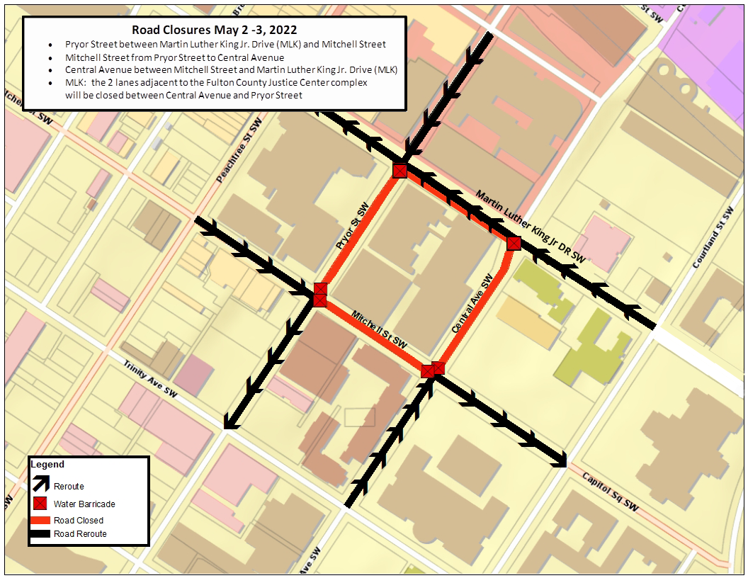 - MLK: the 2 lanes adjacent to the Fulton County Justice Center complex will be closed between Central Avenue and Pryor Street