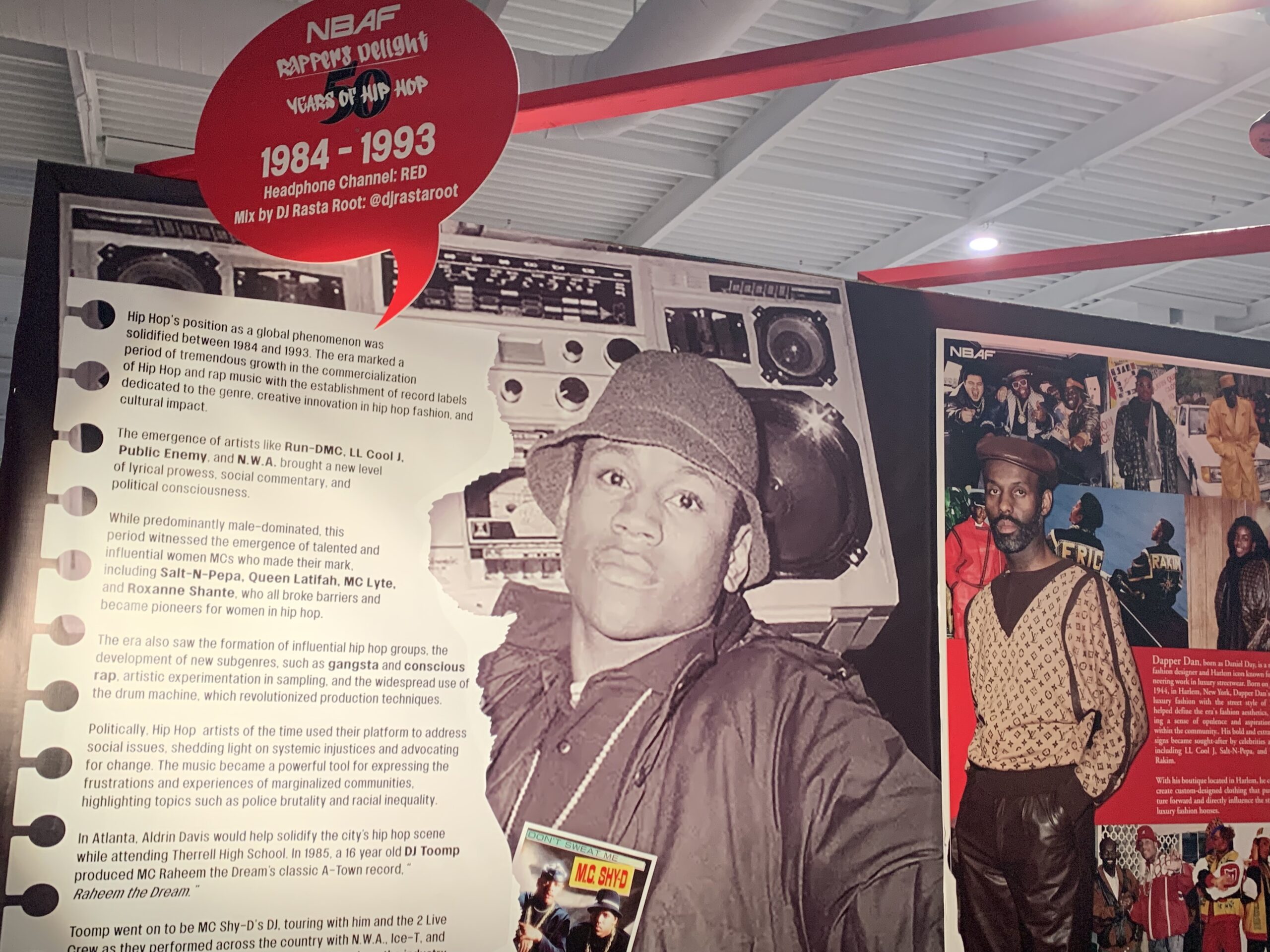 Each installation highlighted specific eras in hip-hop and the most influential artists and DJs of the moment. Guests were given headphones where a silent disco allowed them to hear rap music from different regions and time periods.