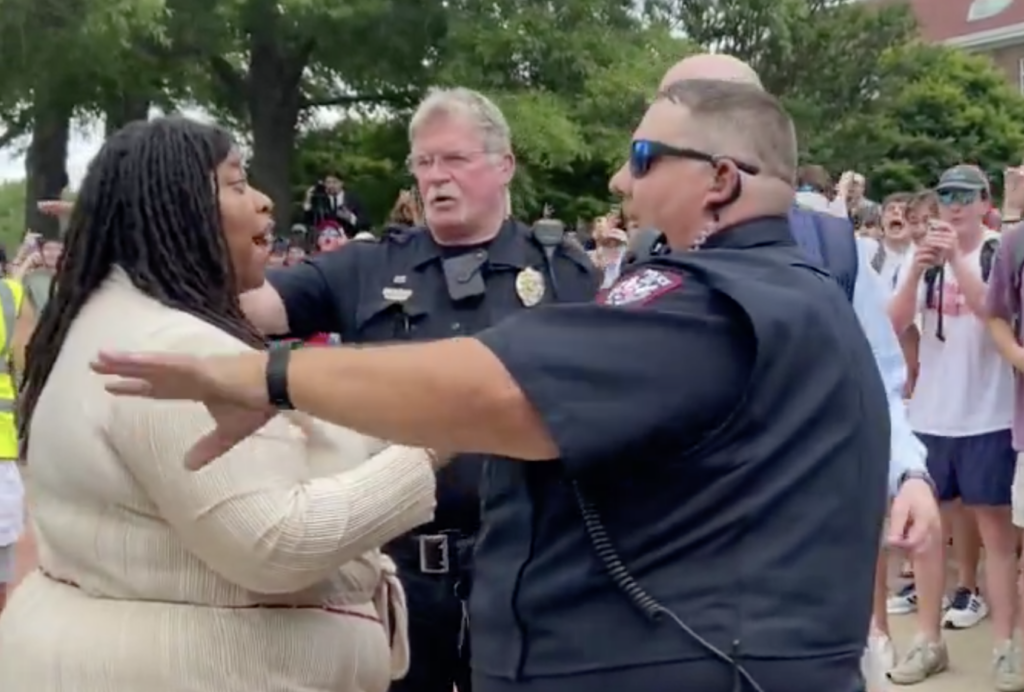 During the protest at Ole Miss, a Black woman could be seen suffering vitriolic verbal attacks from White college students who mockingly called her “Lizzo” and “fat a–” and chanted lock her up urging police officers on the scene to arrest the peaceful counter protestor. As she approaches them, the students begin making monkey noises and imitate the moves of a monkey.